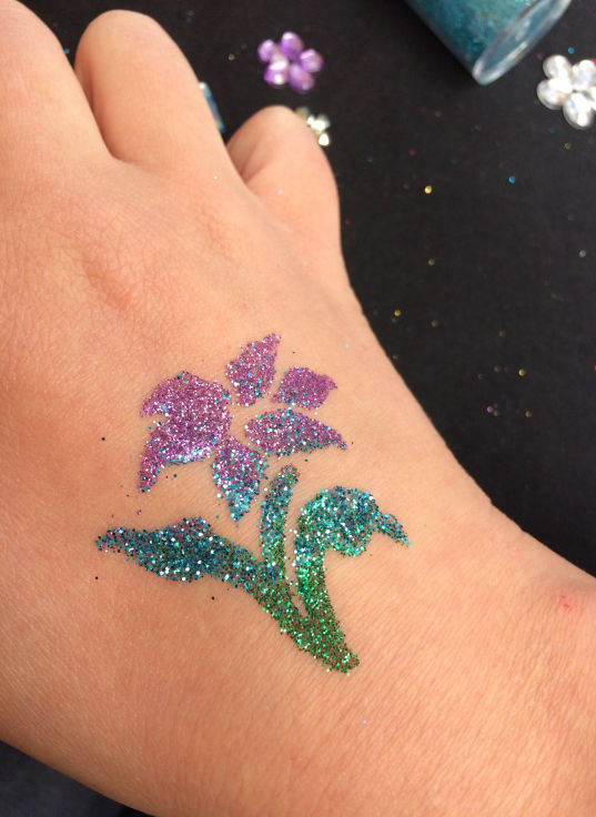 Glitzertattoos sind eine tolle Alternative zum klassischen Kinderschminken, die auch bei Jungendlichen und so manchen Erwachsenen gut ankommt. Ihre Gäste können sich eine der Motivschablonen aussuchen und bekommen dann ein funkelndes Tattoo aus hautfreundlichem Glitzer, das 4-7 Tage hält. Glitzertattoos sind wasserfest und lassen sich mit Öl (z.B. Kokosöl) und ein bissen Geduld durch leichtes Rubbeln entfernen.
